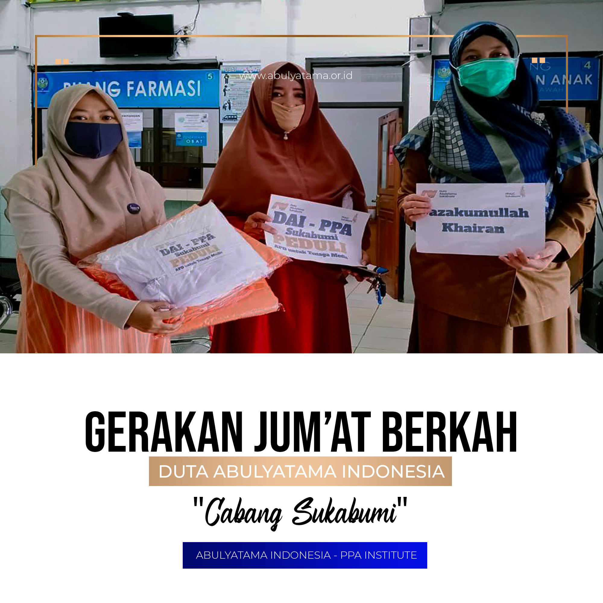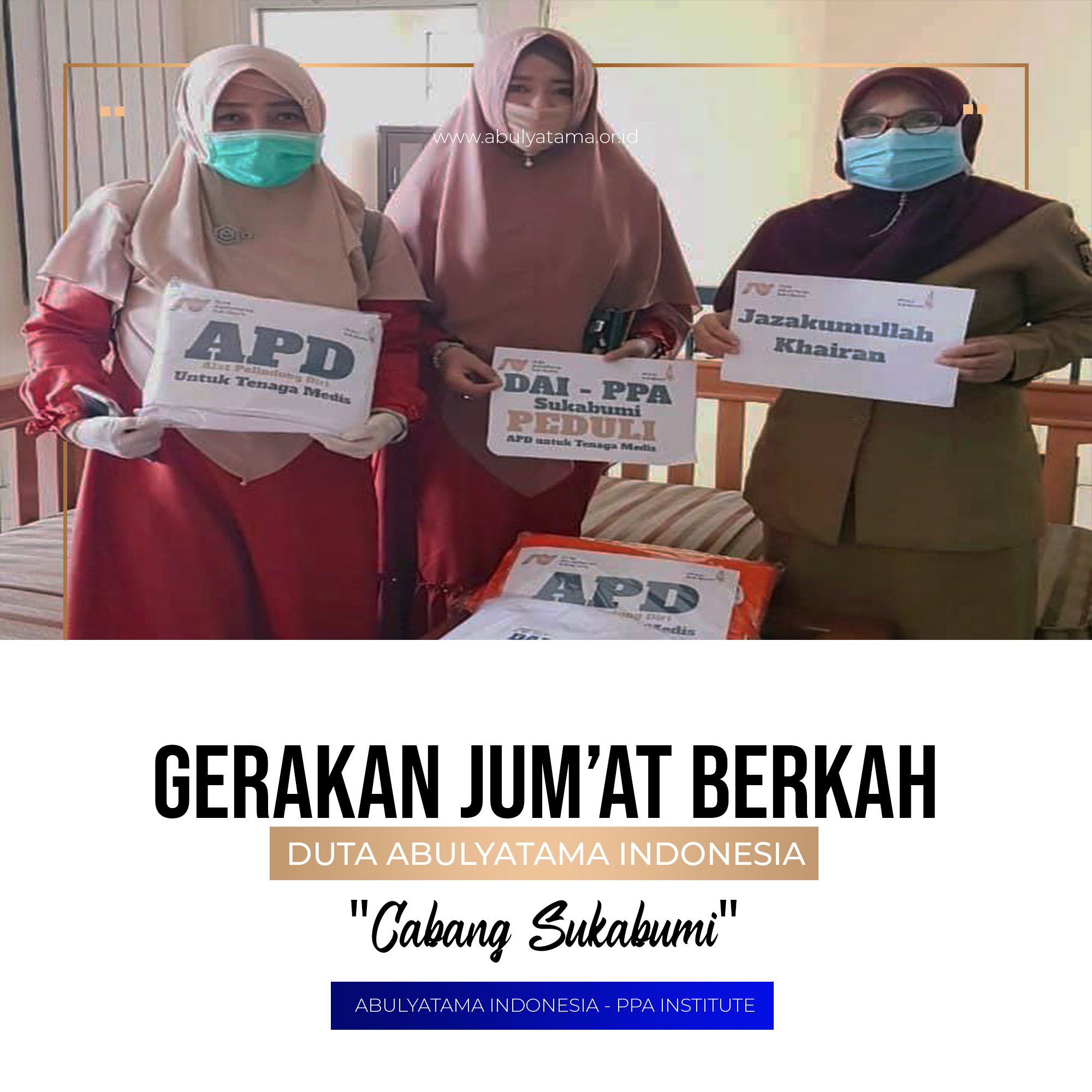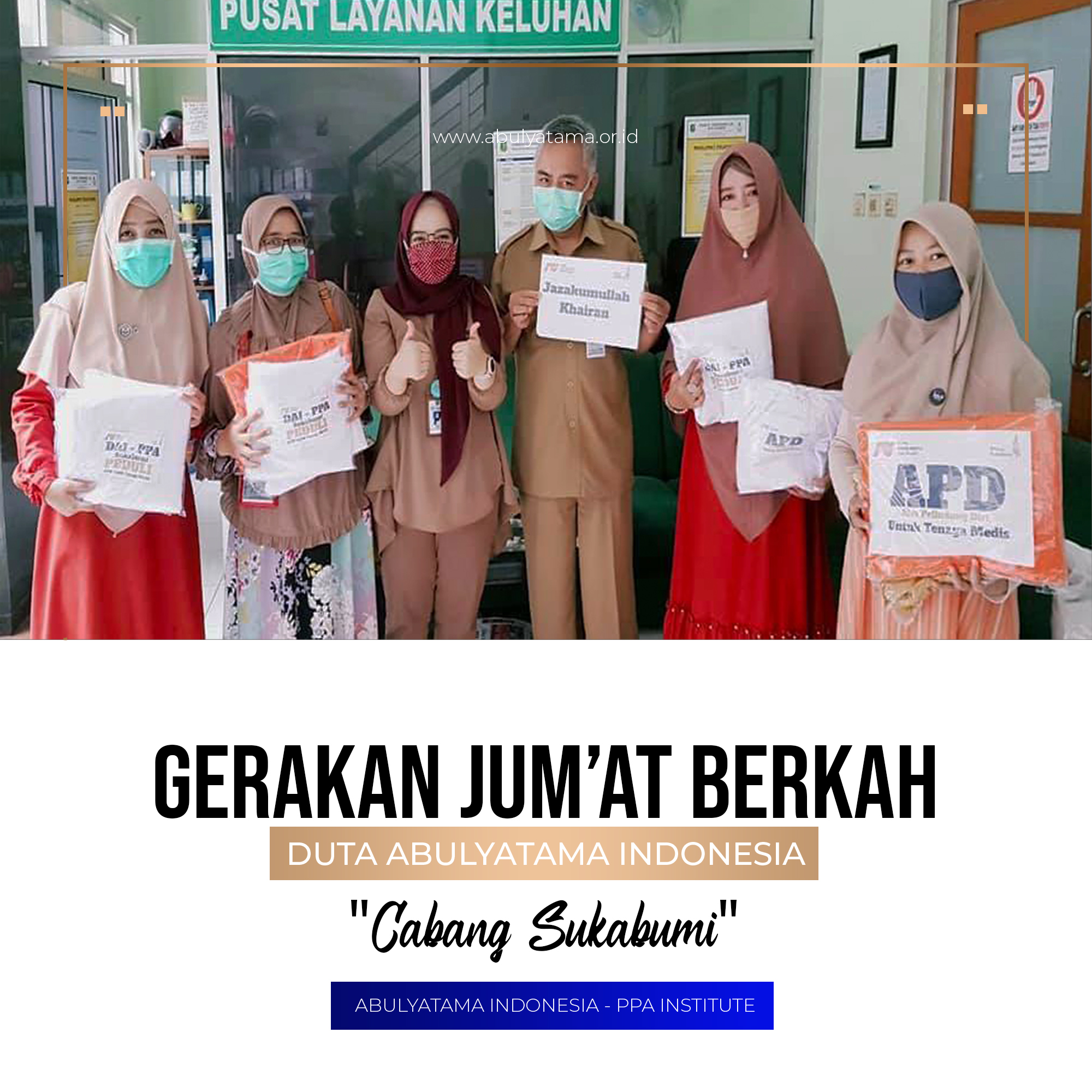Alhamdulillah,. Selasa, 07 April 2020 Duta Abulyatama Indonesia (DAI) dan PPALC cabang Sukabumi telah melaksanakan Gerakan Jumat Berkah (GJB) dengan membantu mencegah penyebaran virus Corona (COVID-19), dengan berbagi APD gratis berjumlah 31 pcs kepada para tenaga medis yang sedang berjuang mengatasi infeksi Covid-19 yang disalurkan kepada beberapa instalasi kesehatan di antaranya :